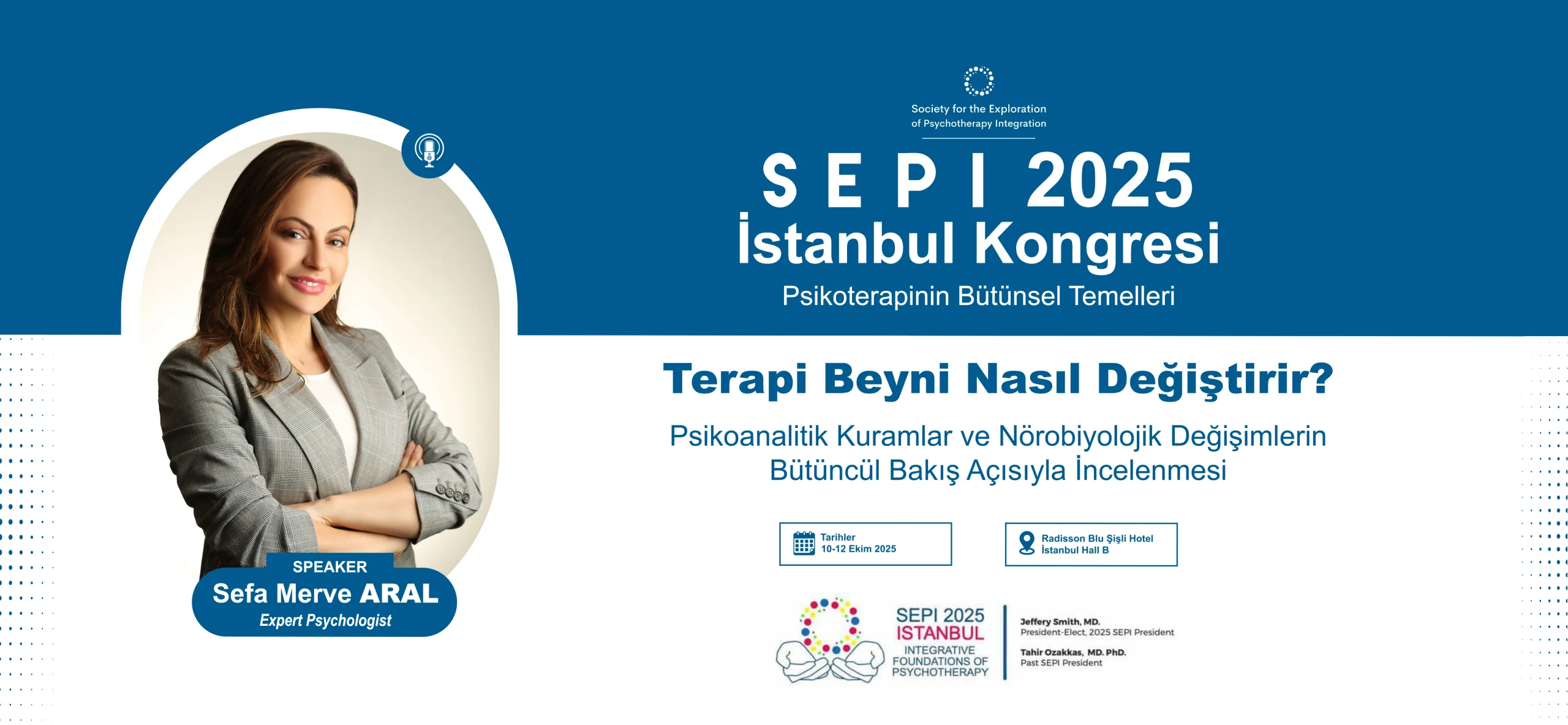 10–12 Ekim 2025 tarihleri arasında SEPI İstanbul Kongresi‘nde konuşmacı ve panel moderatörü olarak yer alacak Uzm. Psikolog Merve Aral, “Nöroplastisite ve Psikoterapinin Nörobiyolojik Temelleri” başlıklı sunumuyla sahne alacaktır.